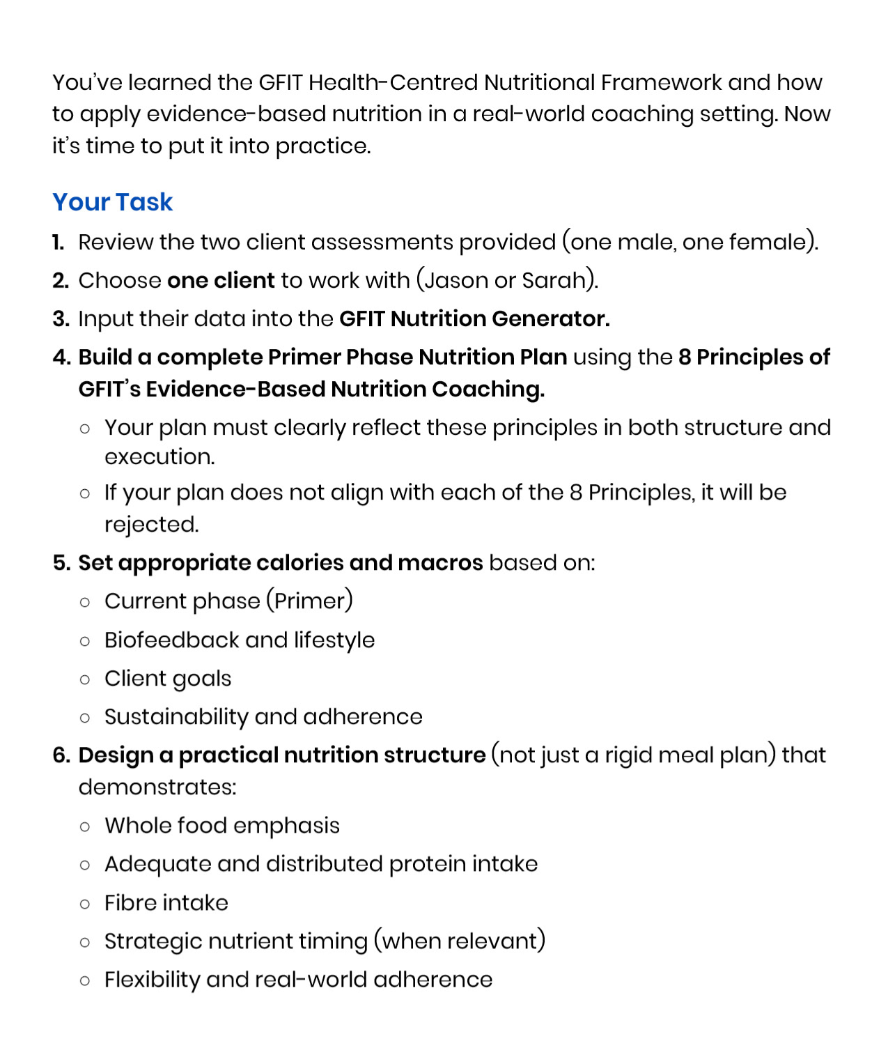 In this module, you’ll learn GFIT’s evidence-based approach to nutrition. We’ll cover the principles behind every transformation—calories, macros, food quality, timing, and flexibility. You’ll also see how to use the Nutrition Generator to create personalized, phase-specific plans that align with client goals & Dietitian standards. Most importantly, you’ll learn how to design plans that are simple to follow and built for lasting results.