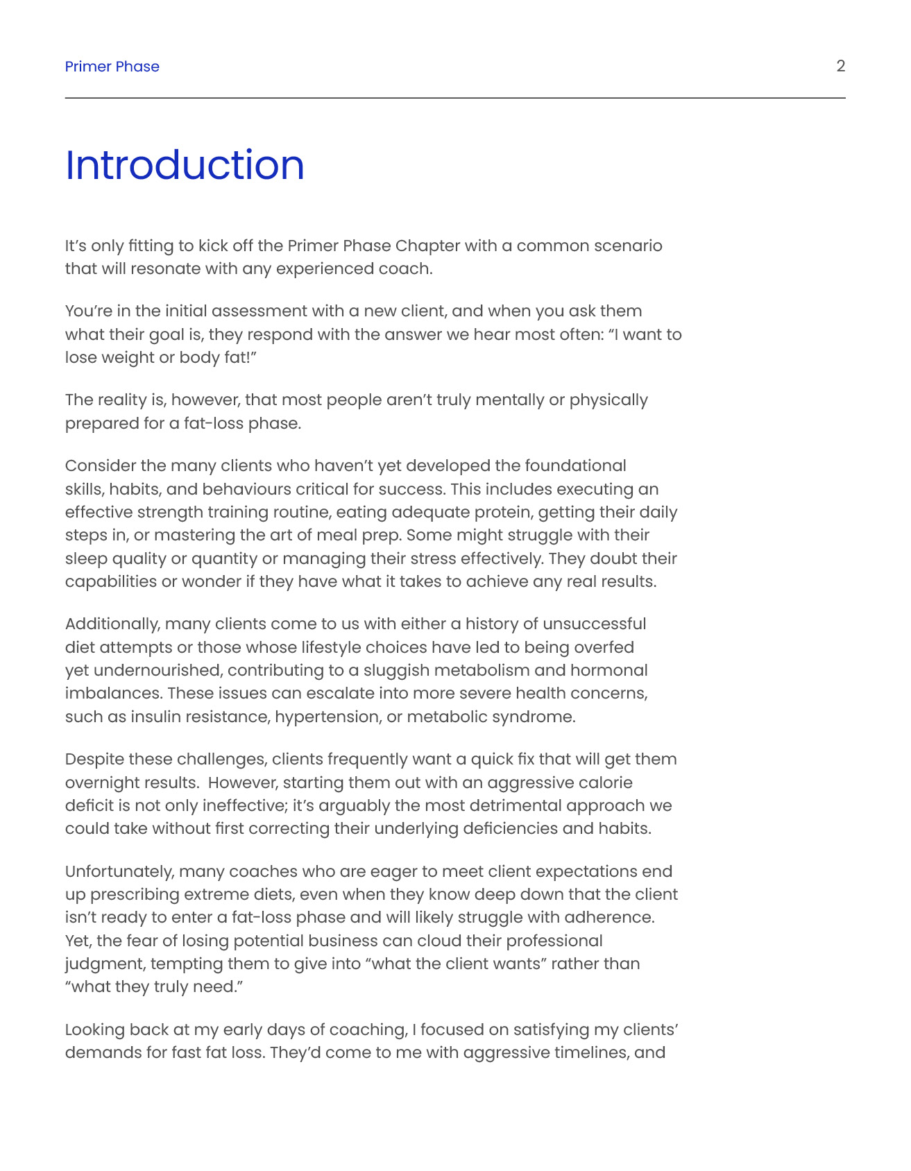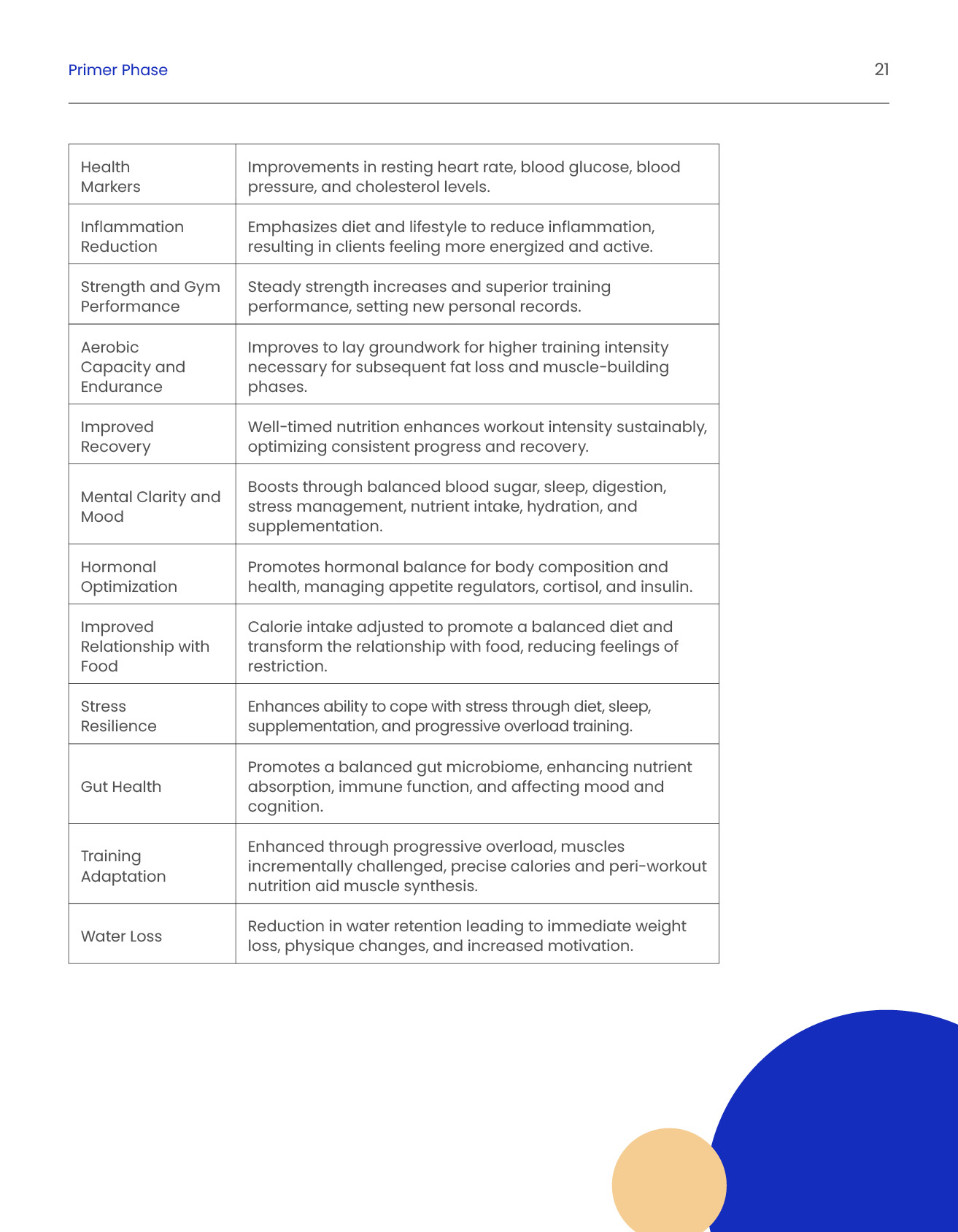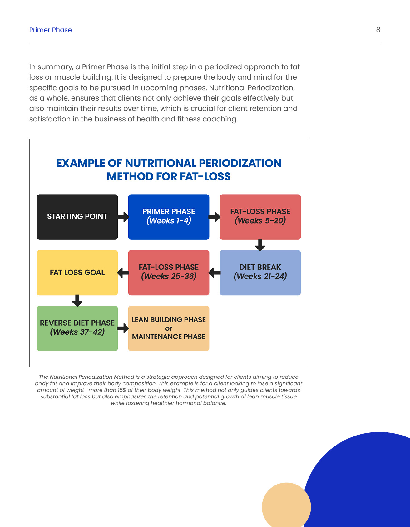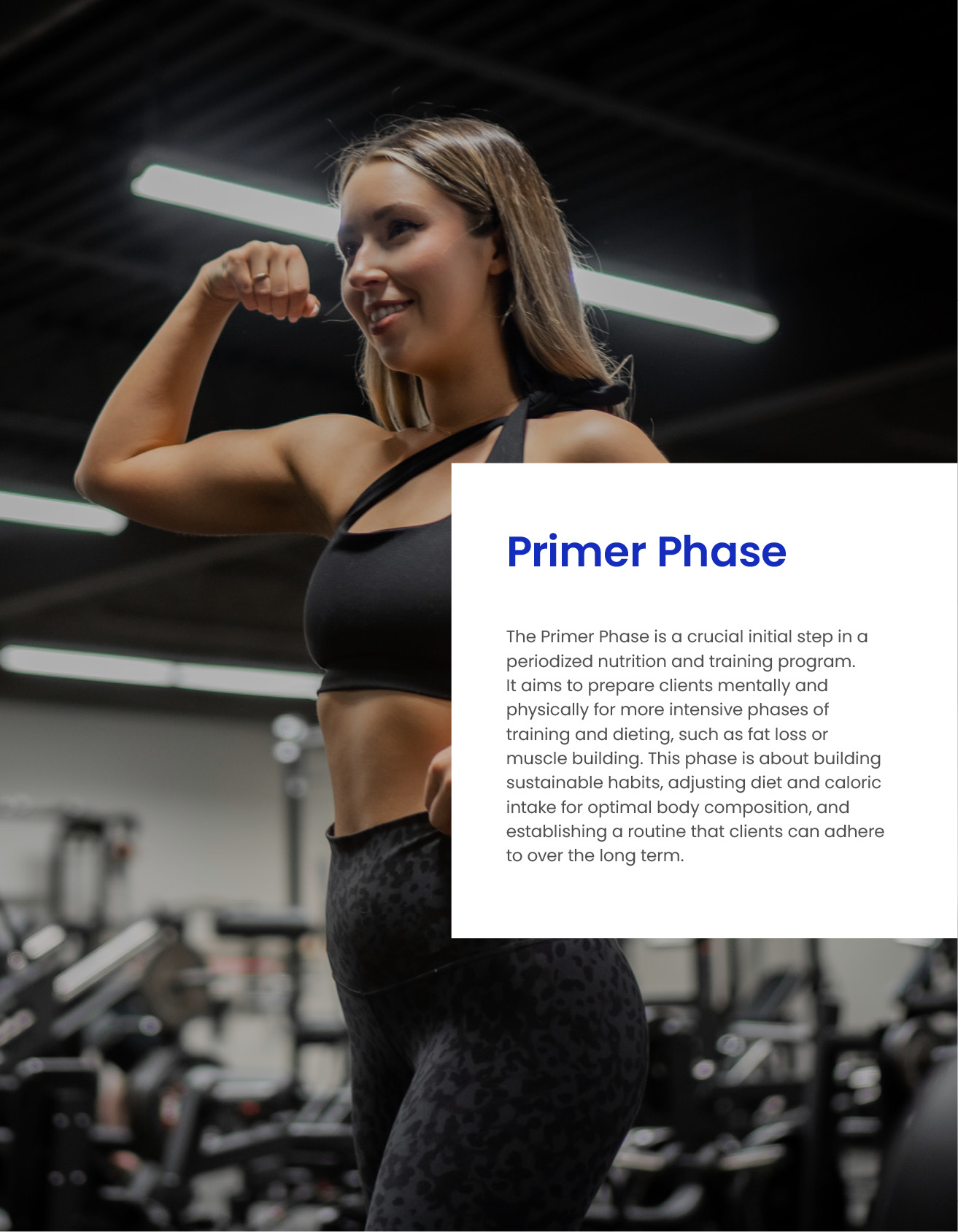The Primer Phase is a crucial initial step in a periodized nutrition and training program. It aims to prepare clients mentally and physically for more intensive phases of training and dieting, such as fat loss or muscle building. This phase is about building sustainable habits, adjusting diet and caloric intake for optimal body composition, and establishing a routine that clients can adhere to over the long term.