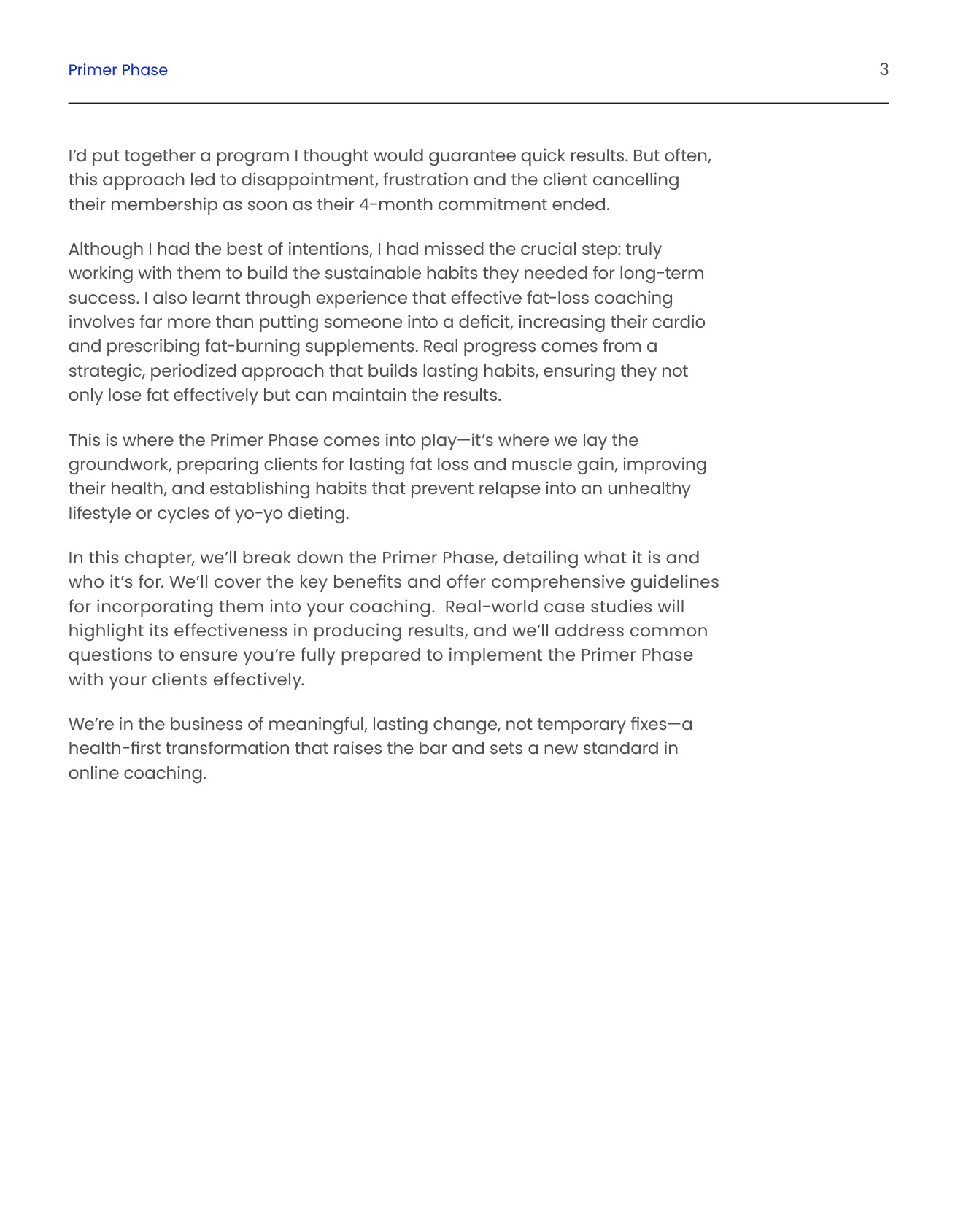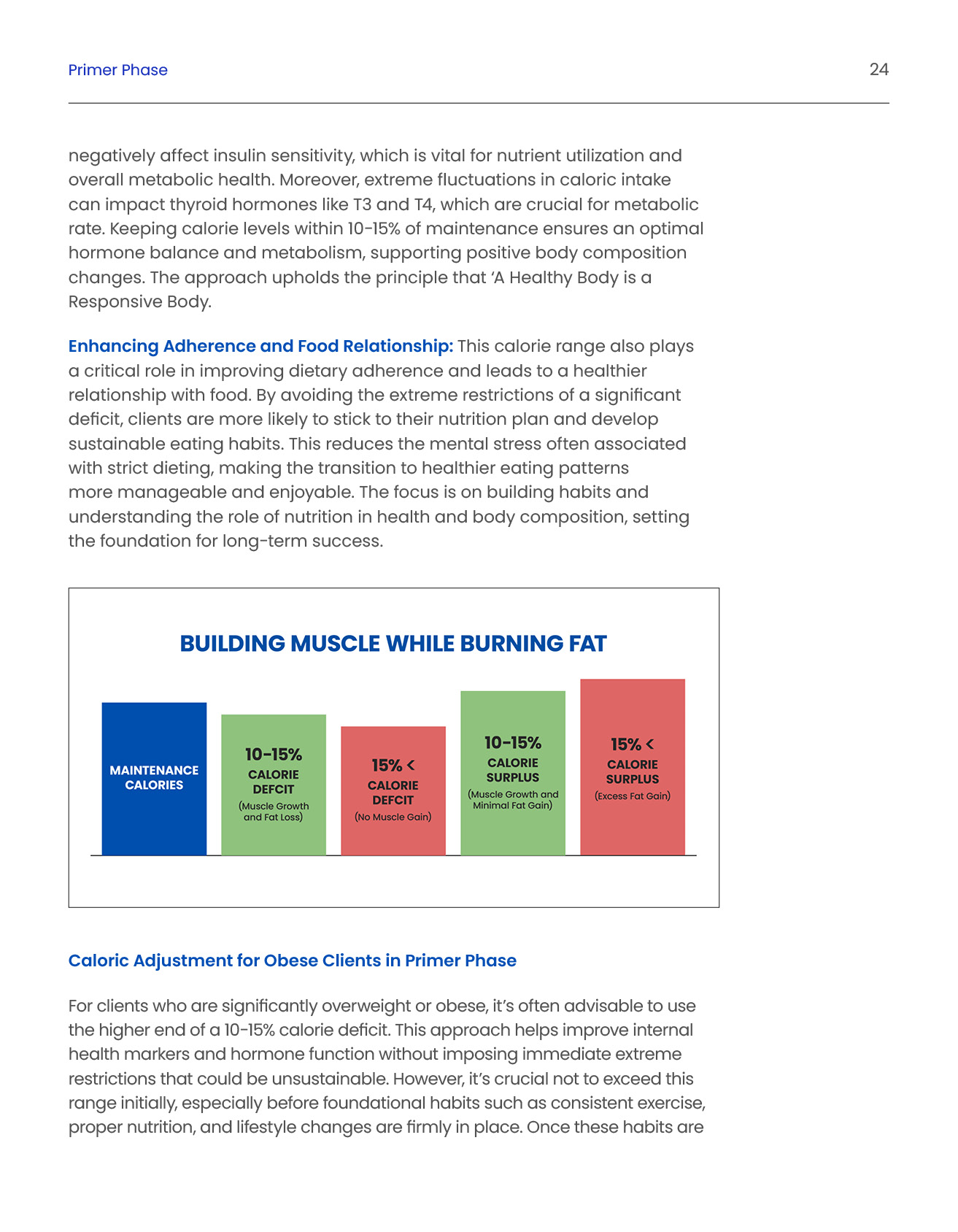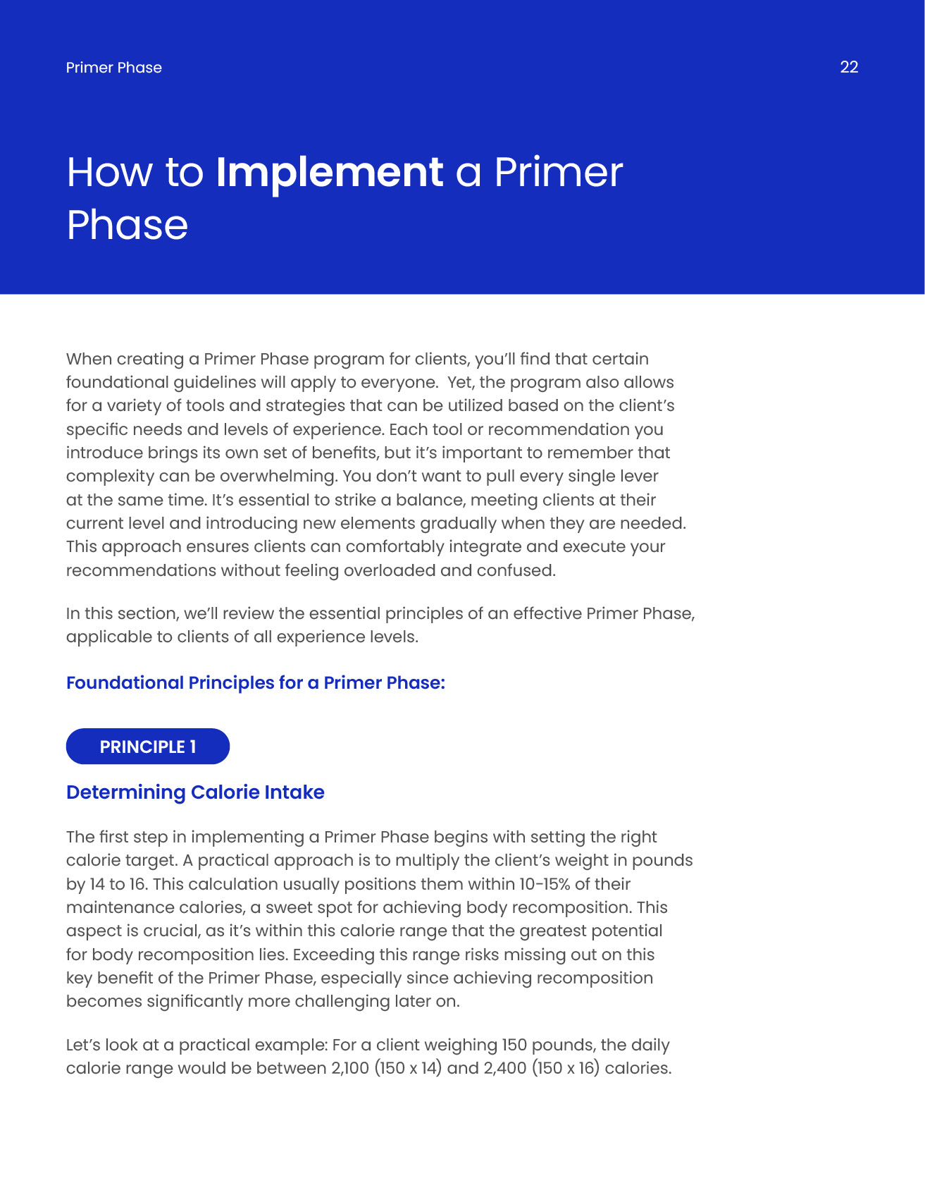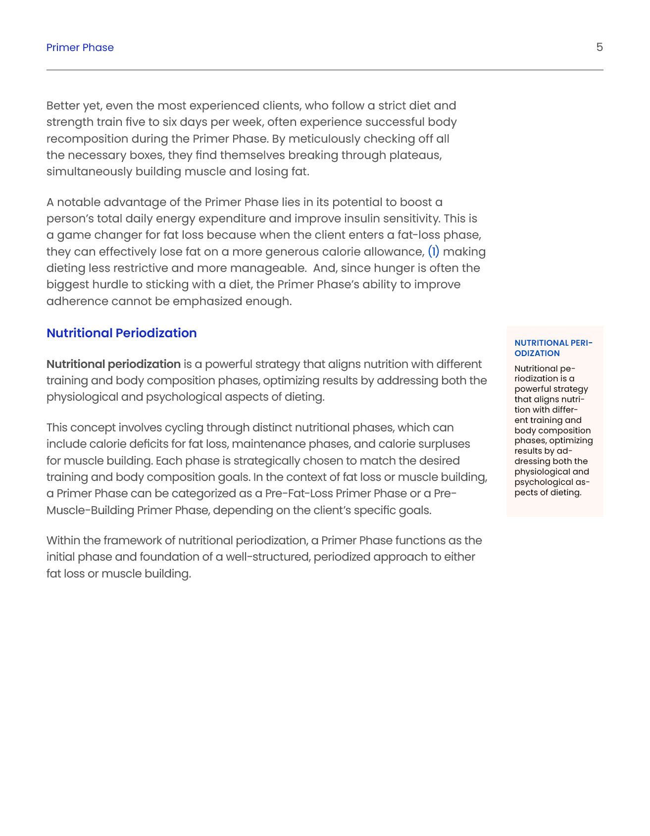 The Primer Phase is a crucial initial step in a periodized nutrition and training program. It aims to prepare clients mentally and physically for more intensive phases of training and dieting, such as fat loss or muscle building. This phase is about building sustainable habits, adjusting diet and caloric intake for optimal body composition, and establishing a routine that clients can adhere to over the long term.