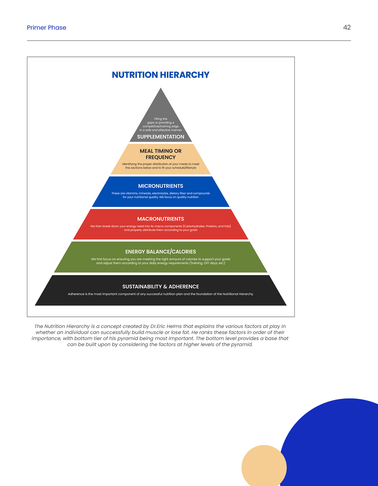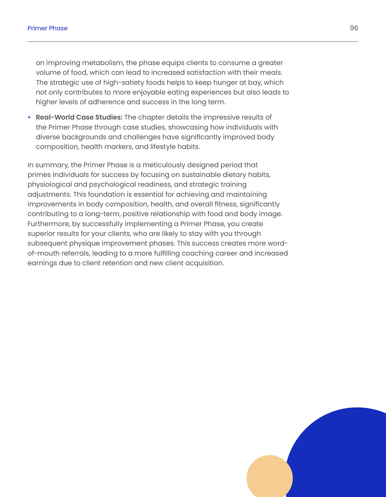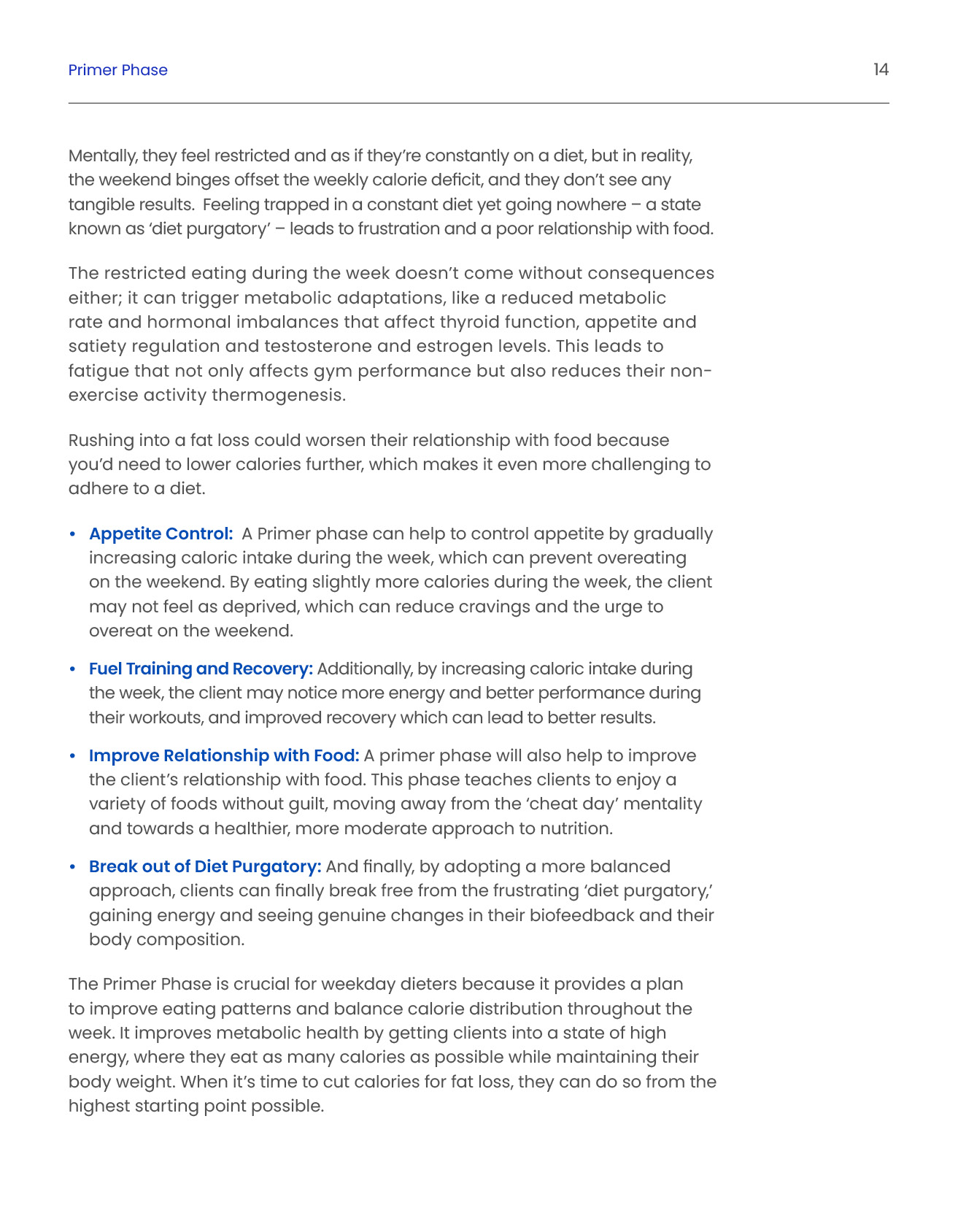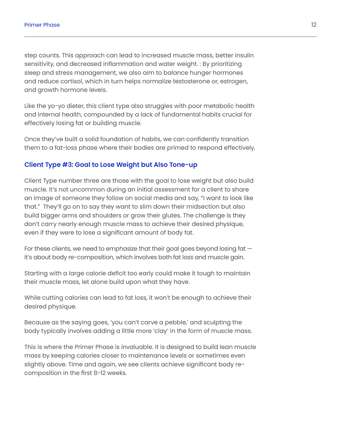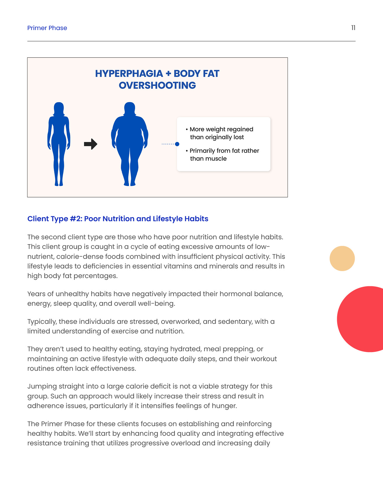 The Primer Phase is a crucial initial step in a periodized nutrition and training program. It aims to prepare clients mentally and physically for more intensive phases of training and dieting, such as fat loss or muscle building. This phase is about building sustainable habits, adjusting diet and caloric intake for optimal body composition, and establishing a routine that clients can adhere to over the long term.
