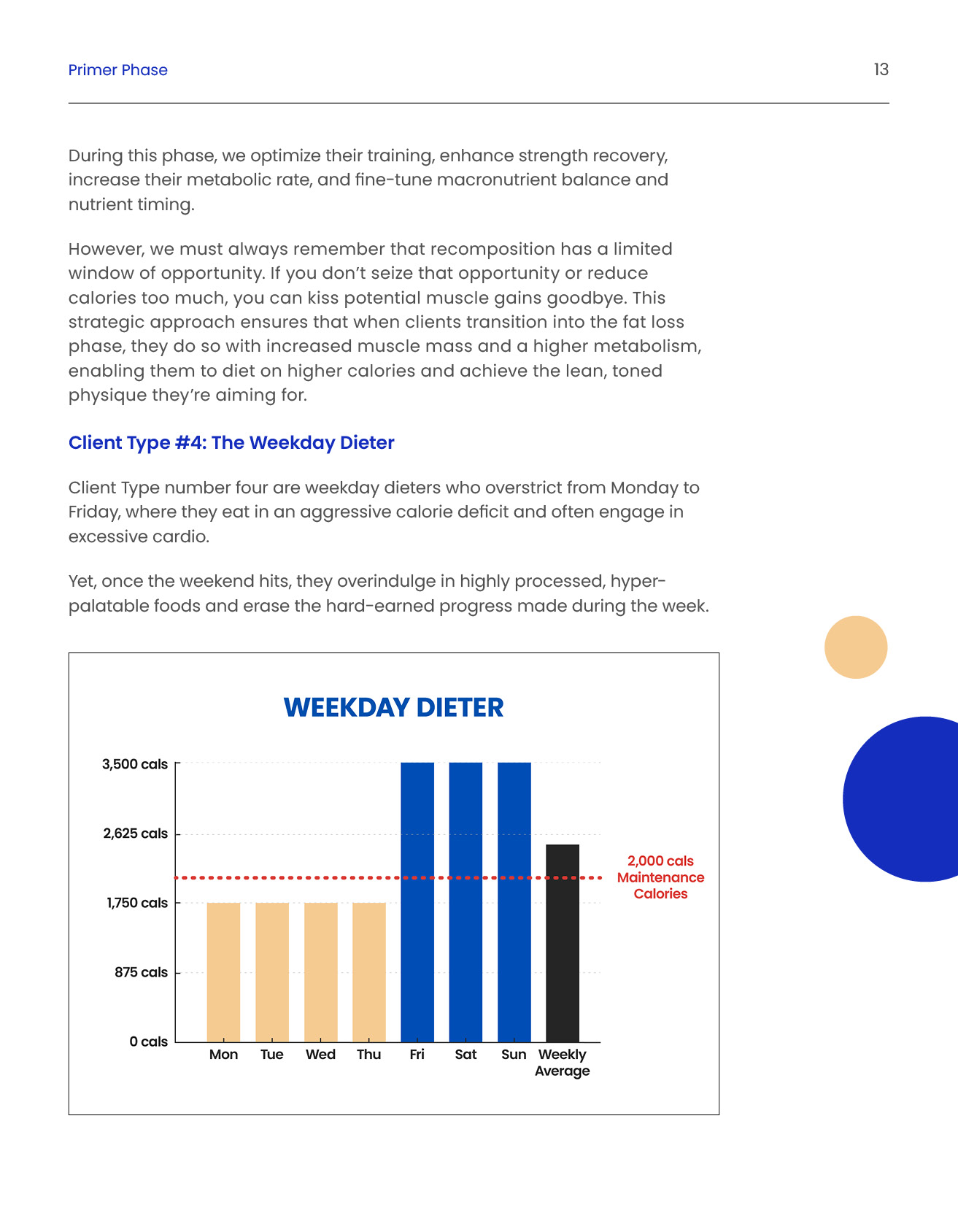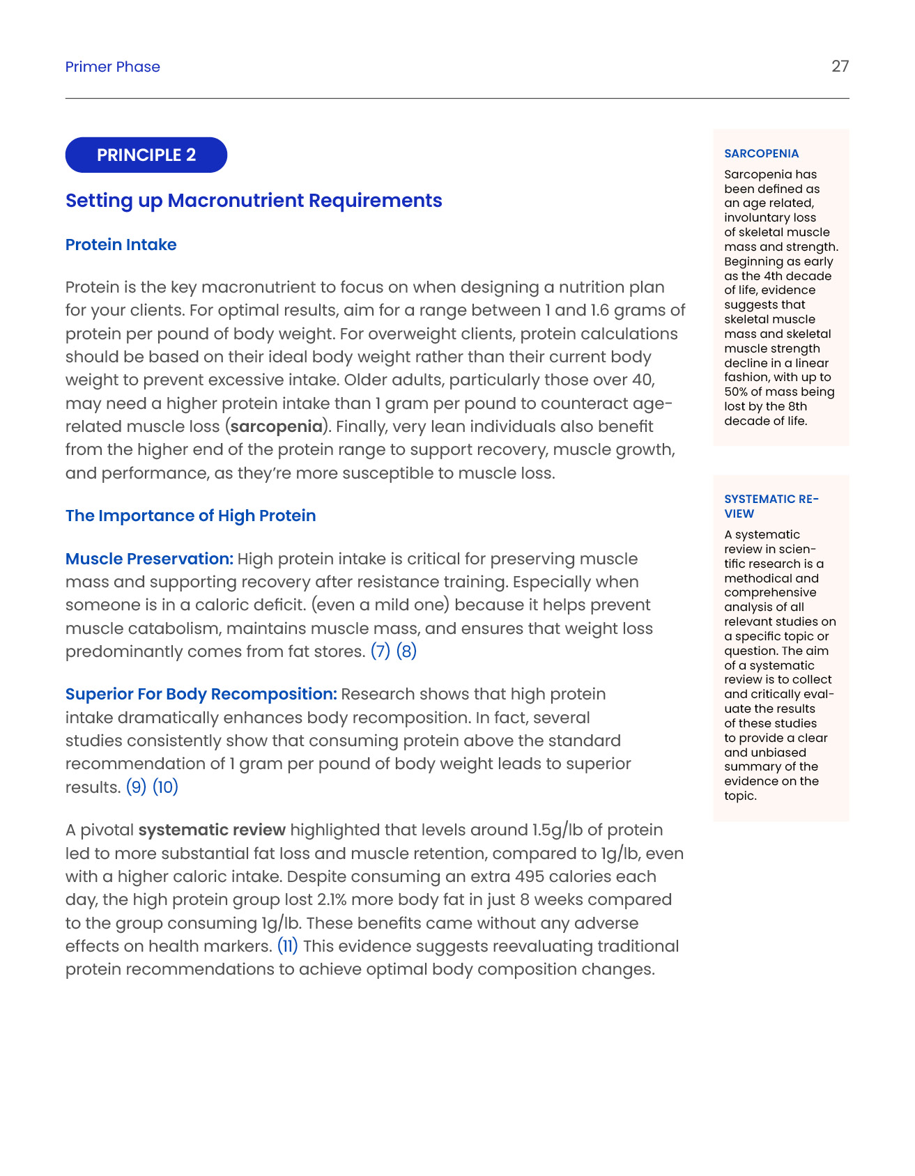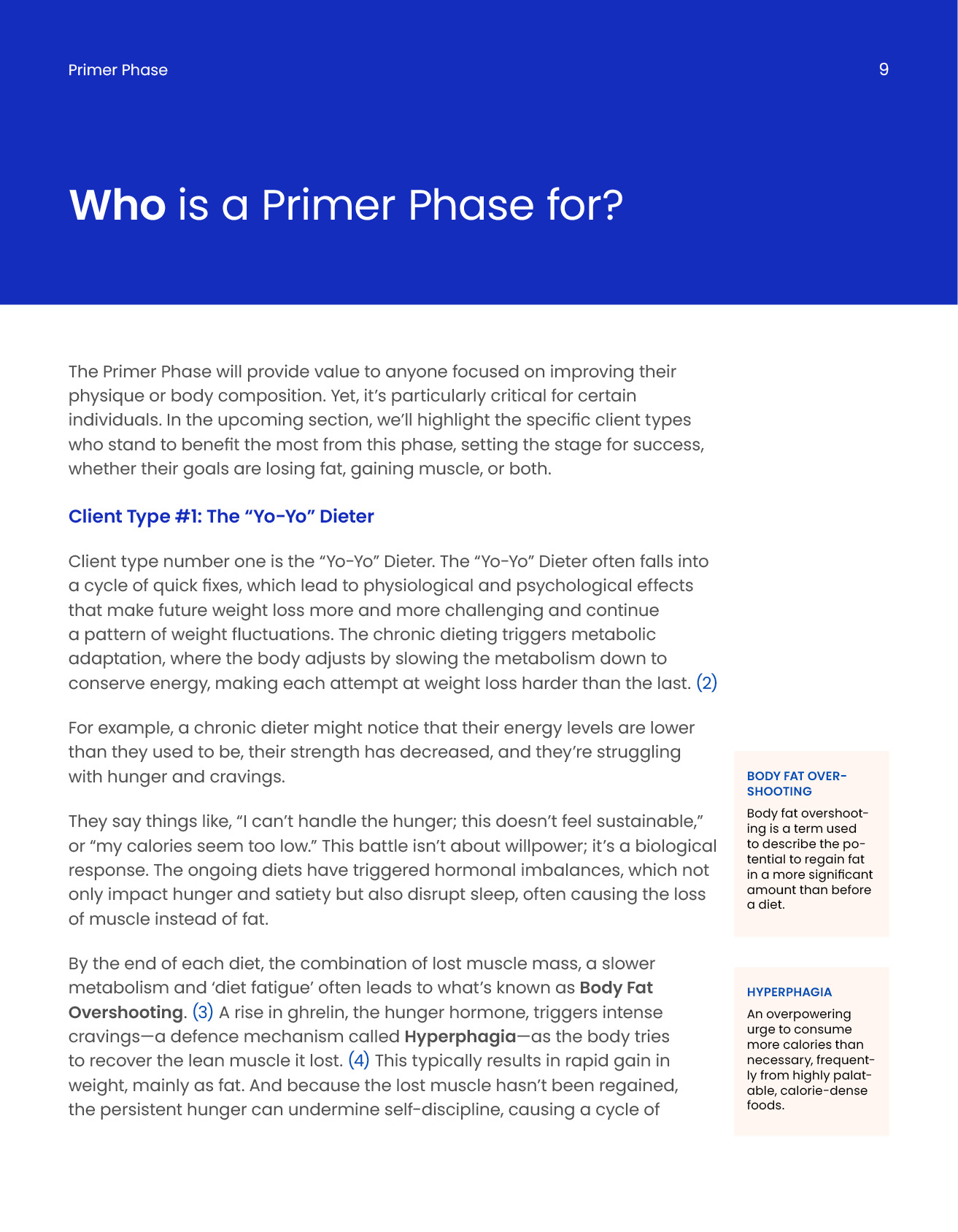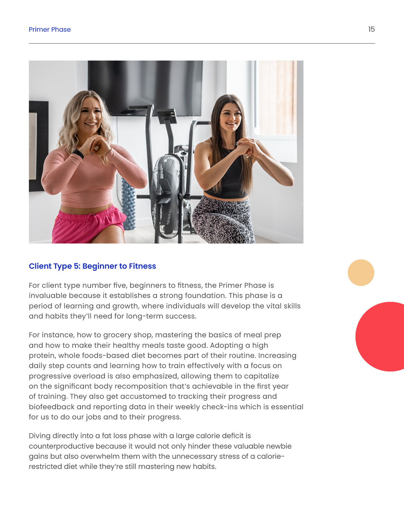 The Primer Phase is a crucial initial step in a periodized nutrition and training program. It aims to prepare clients mentally and physically for more intensive phases of training and dieting, such as fat loss or muscle building. This phase is about building sustainable habits, adjusting diet and caloric intake for optimal body composition, and establishing a routine that clients can adhere to over the long term.