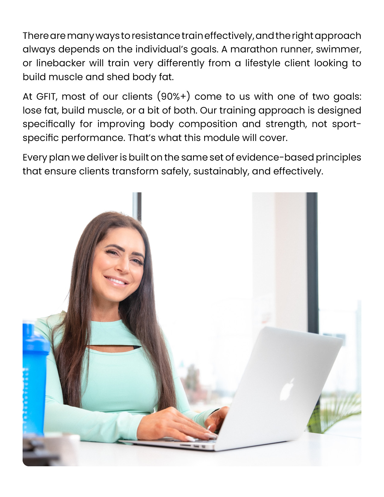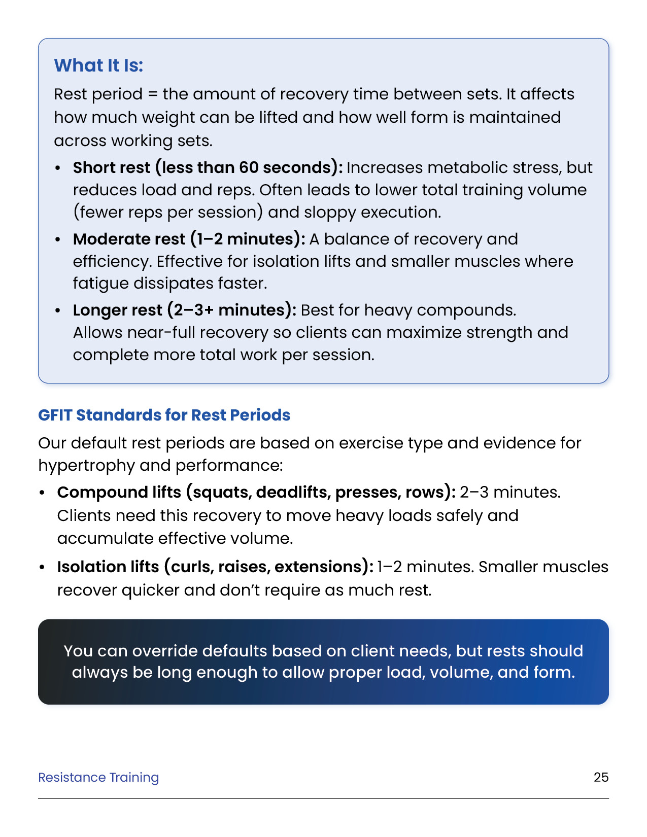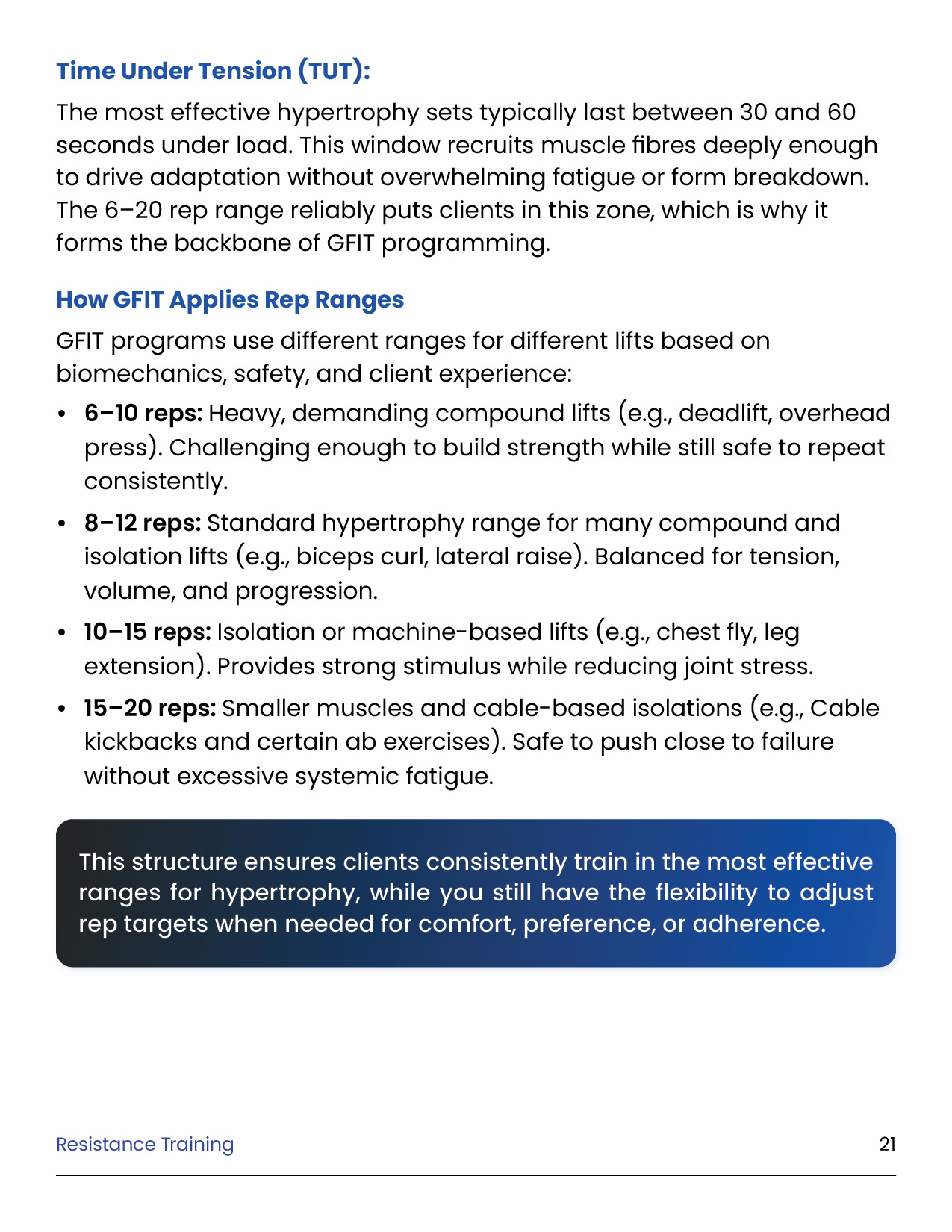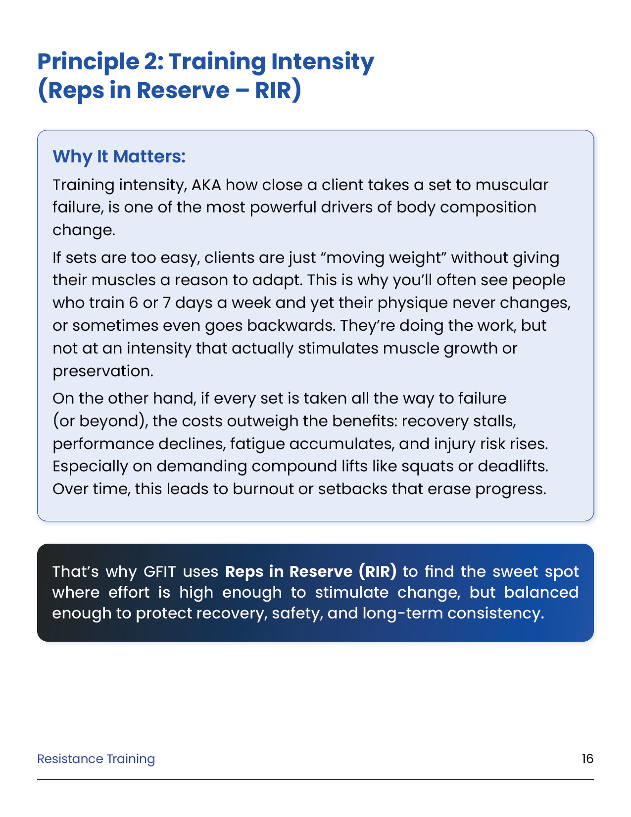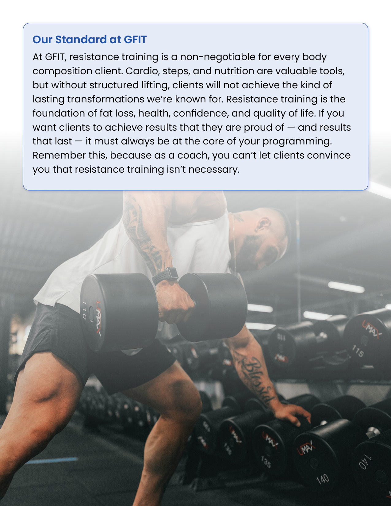 Resistance training is the foundation of every successful body transformation. It preserves muscle in a deficit, builds strength and definition, improves metabolism and health, and creates the physique clients truly want. This module equips you with the principles, standards, and tools to design evidence-based training plans in the GFIT Workout Generator — ensuring safe, sustainable progress for every client.