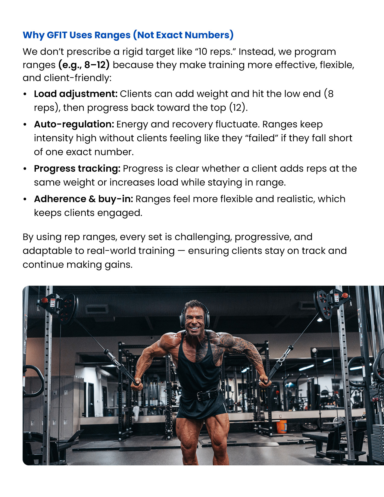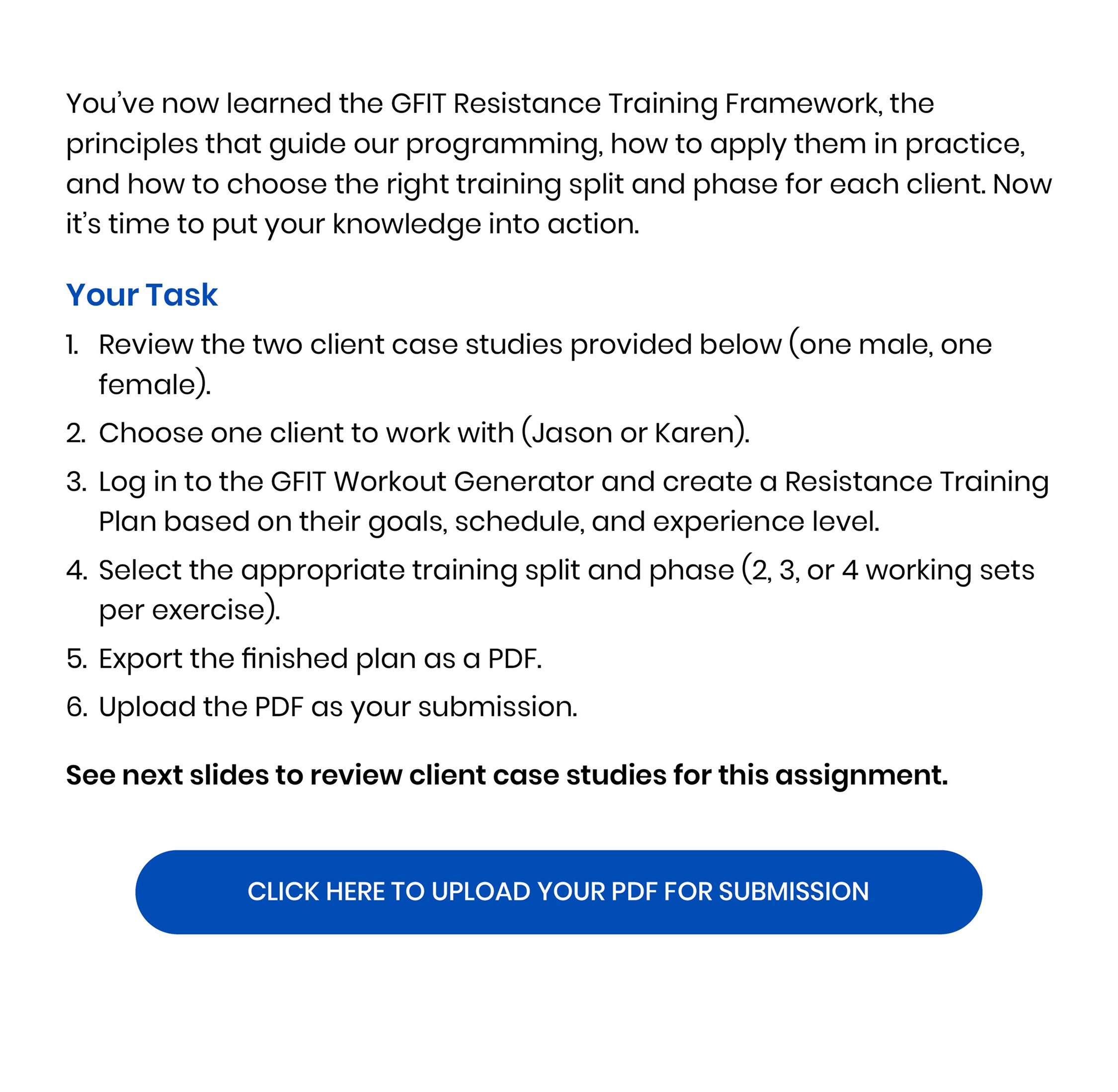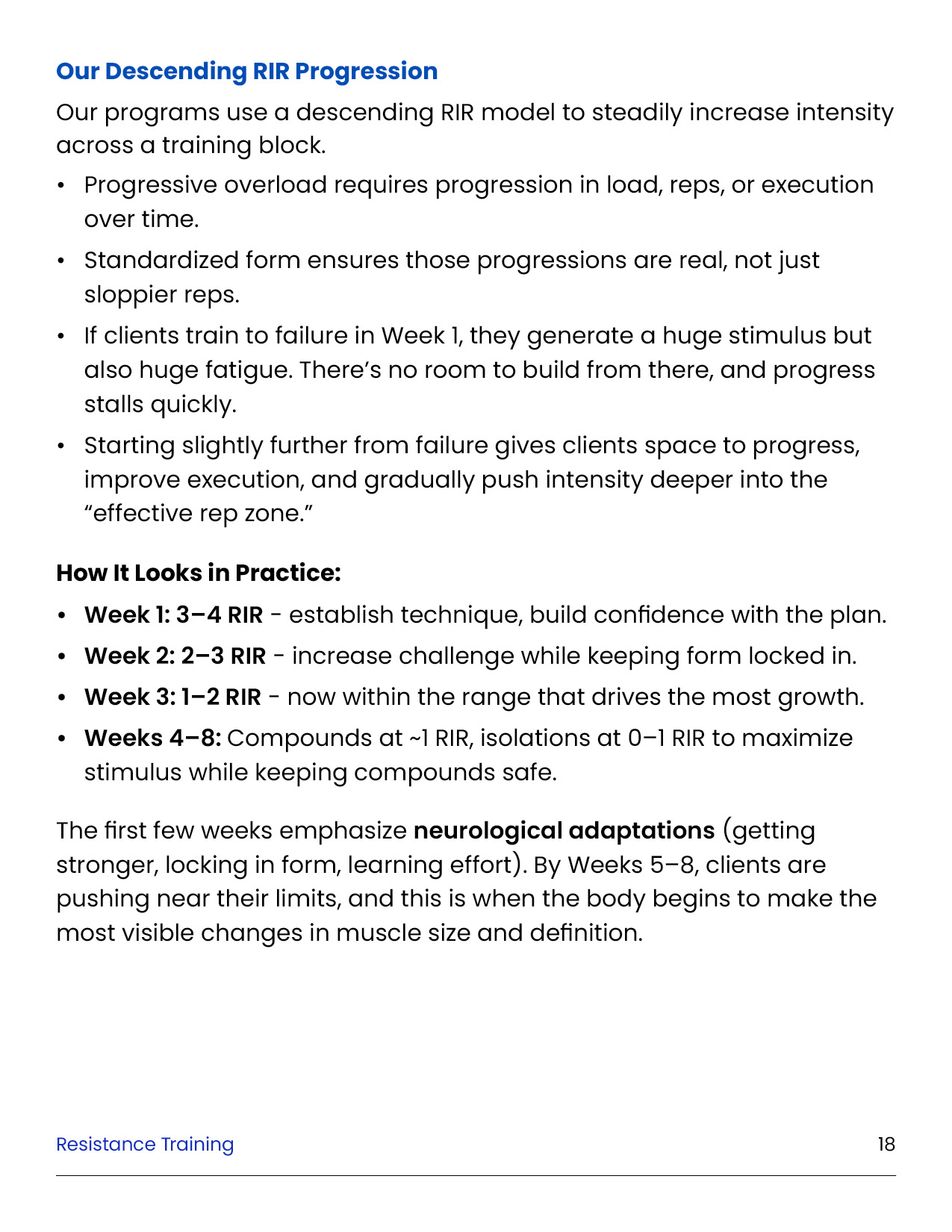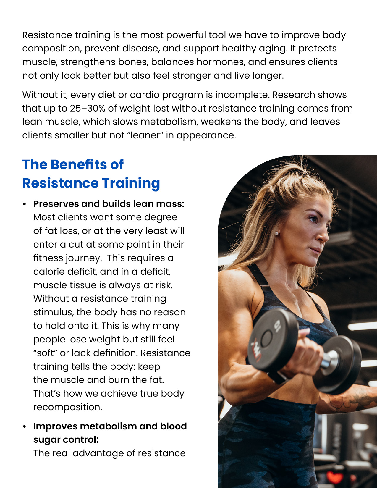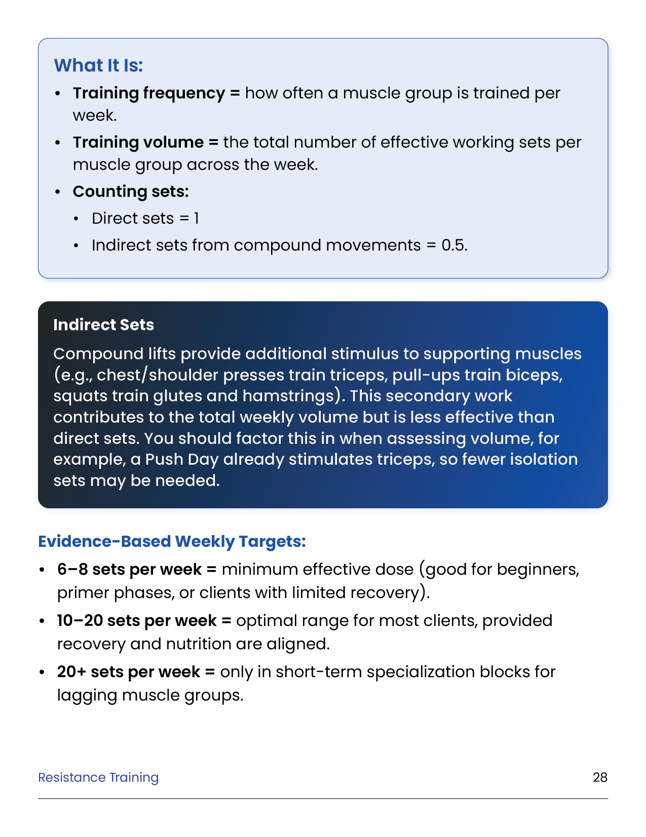Resistance training is the foundation of every successful body transformation. It preserves muscle in a deficit, builds strength and definition, improves metabolism and health, and creates the physique clients truly want. This module equips you with the principles, standards, and tools to design evidence-based training plans in the GFIT Workout Generator — ensuring safe, sustainable progress for every client.